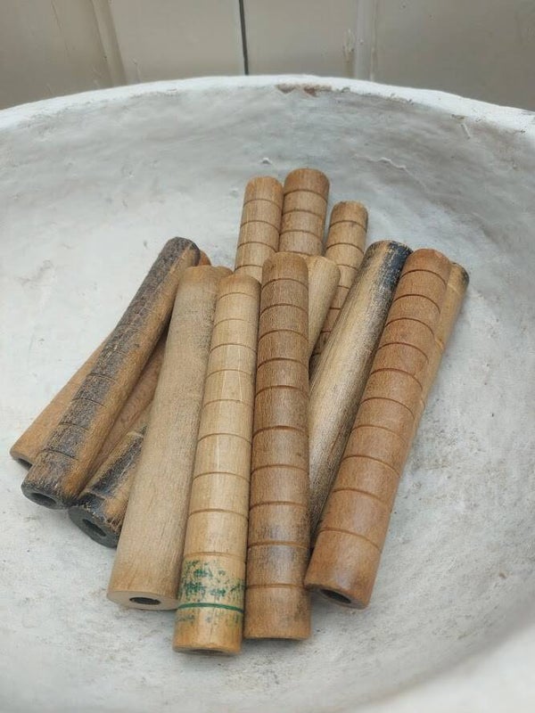 Deze houten spoelen werden historisch gebruikt om garen, draad of andere materialen op te winden voor opslag of gebruik in textielmachines. Zoals weefgetouwen.