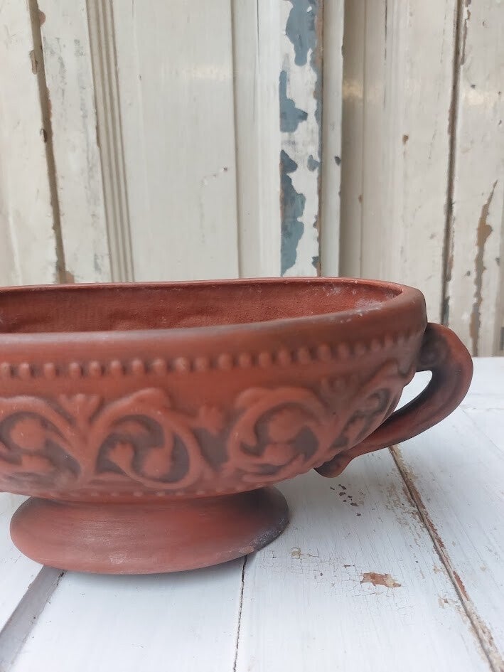♥ Plantenbak op voet van terracottakleurig aardewerk.