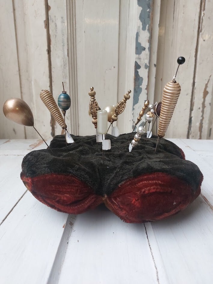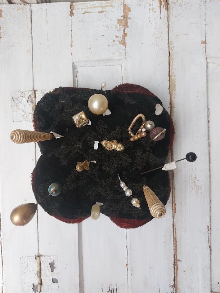 Vintage fluwelen speldenkussen met decoratieve oude hoedenspelden. Kussen krijg je er gratis bij!
