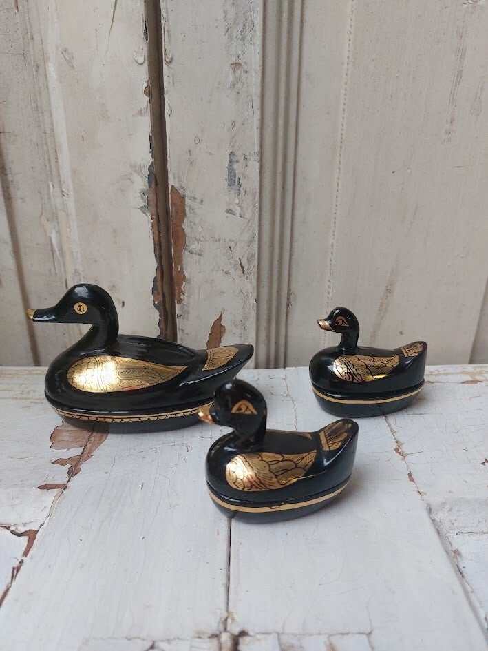 Dit zijn vintage zwarte gelakte eend vormige snuisterij- of sieradendoosjes. Ze zijn vaak met de hand gesneden uit hout en vervolgens zwart gelakt en met de hand beschilderd met gouden accenten, zoals te zien is op de vleugels en het hoofd. Dit type lakwerk is vaak afkomstig uit Aziatische landen zoals Thailand of Birma (Myanmar), waar deze stijl van vakmanschap traditioneel is.