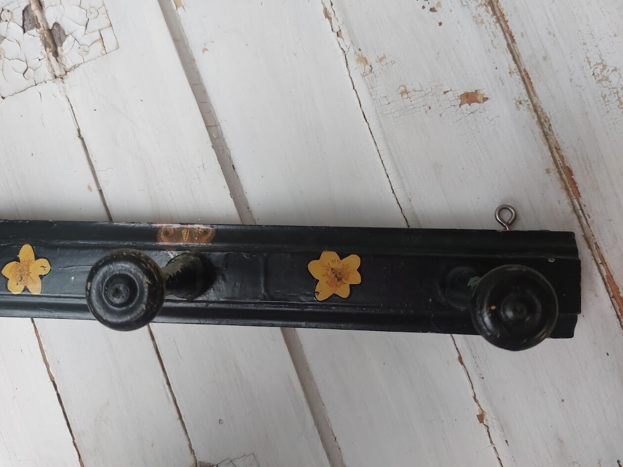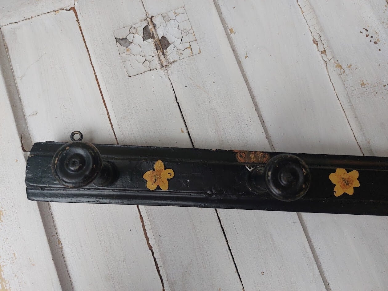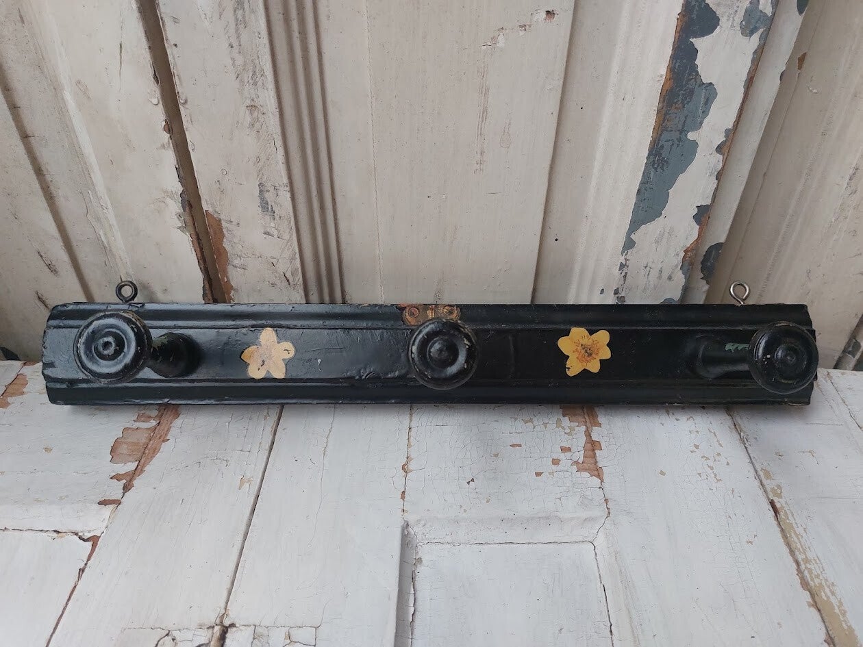 De plank is van hout, geverfd in het zwart. Kenmerkend zijn de geschilderde gele bloemetjes die een charmant, rustiek karakter geven.