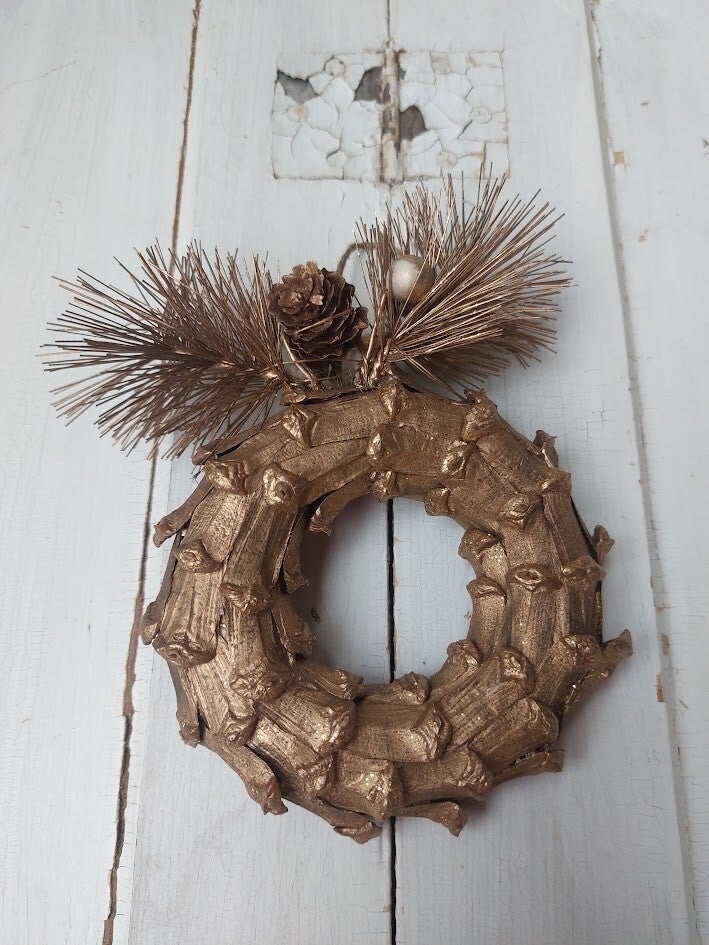 De krans is gemaakt van gedroogde of kunstmatige natuurlijke materialen, zoals dennenappels, takken en naalden, die goud zijn geverfd.
