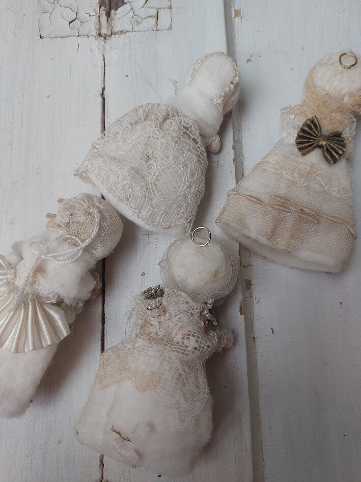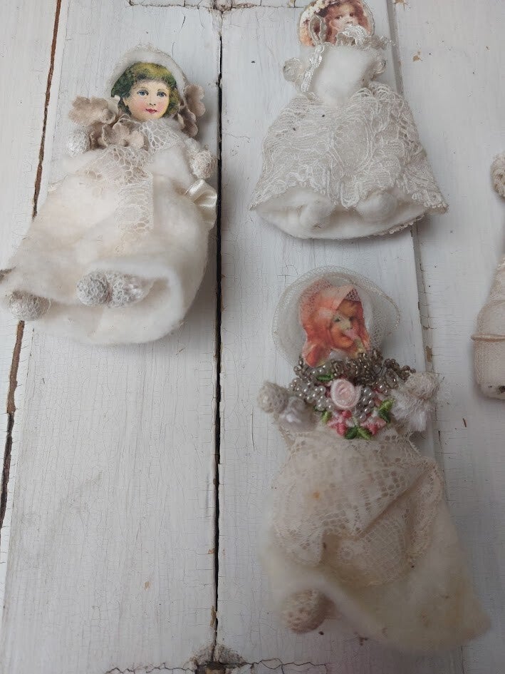Setprijs Dit zijn vintage of antieke decoraties, vaak aangeduid als 'wattenpopjes' of 'ribbon paper dolls'. Ze zijn populair als nostalgische kerst- of Victoriaanse ornamenten. Het zijn handgemaakte figuurtjes, vaak gemaakt van watten (spun cotton), crêpepapier en kant. De gezichtjes zijn meestal gedrukte litho's of uitgesneden papier (die-cuts).