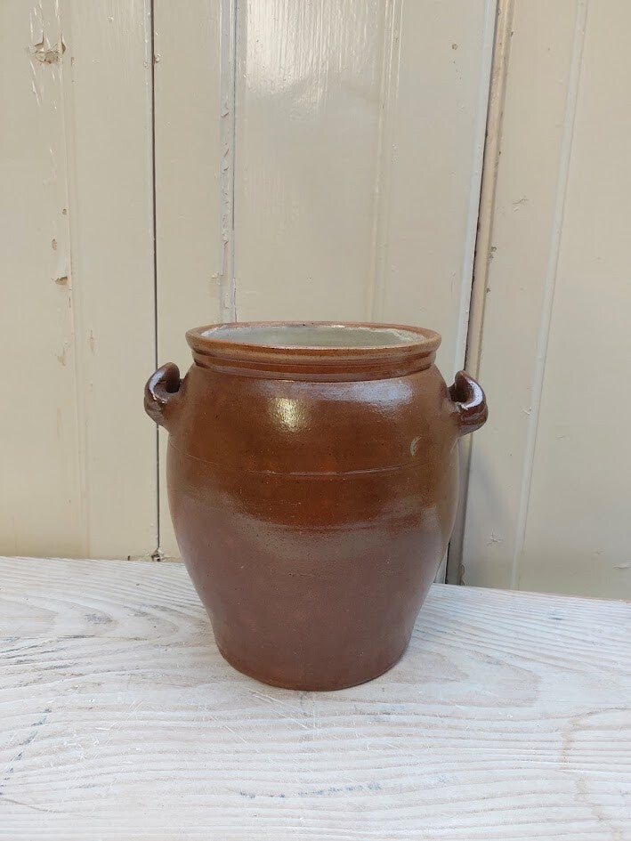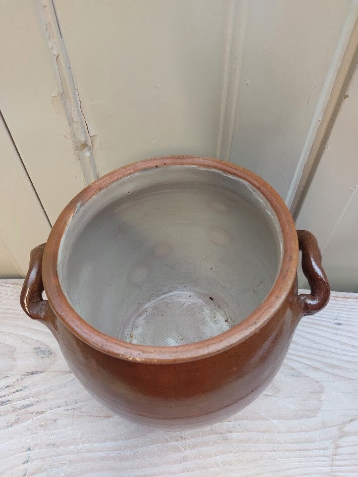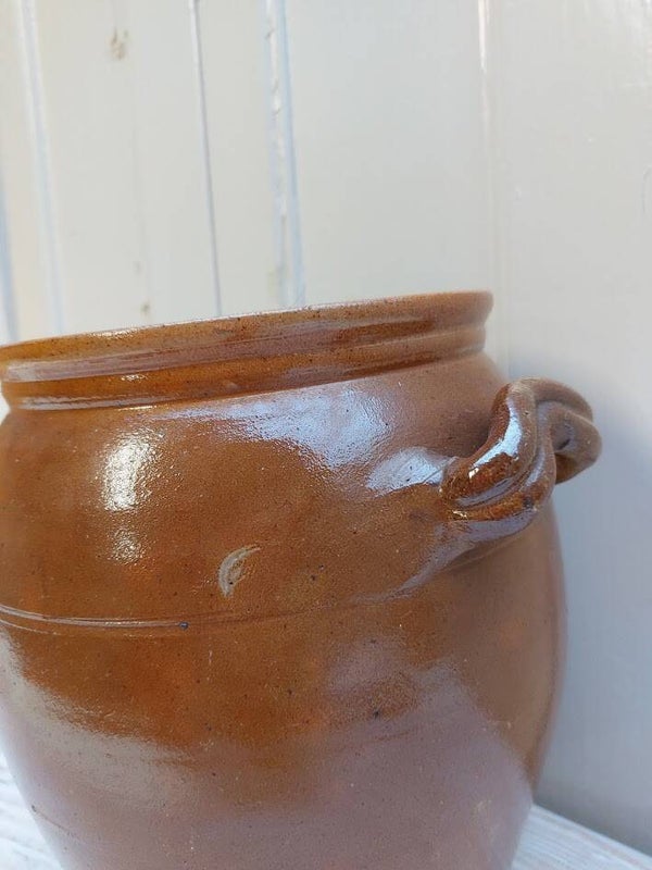 25 x 25 cm De pot op de afbeelding is een antieke Franse grespot (of 'confit pot'). Dit type pot werd traditioneel gebruikt voor het bewaren van voedsel, zoals gezouten bonen, zuurkool of confituren.