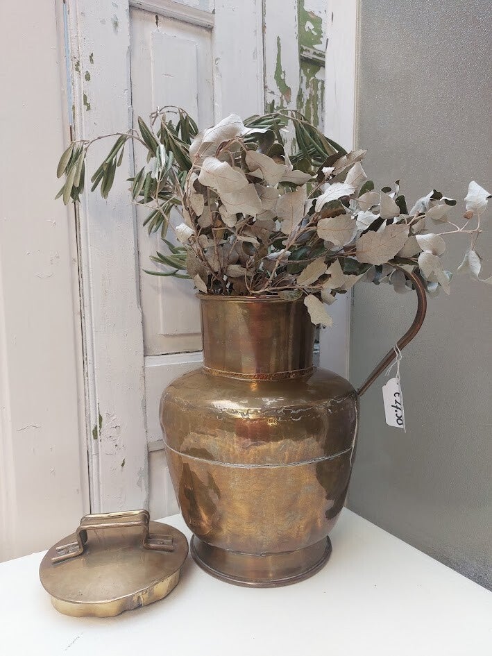 Exclusief planten. Hoogte: 30 cm Gemaakt van gehamerd koper of messing met een deksel. Dit is een vintage koperen of messing (melk)kan, ook wel een melkbus of schenkkan genoemd. Dit type kan is vaak handgemaakt, zoals te zien is aan de gehamerde afwerking en zichtbare naden, en werd traditioneel gebruikt voor het bewaren en vervoeren van vloeistoffen zoals melk of water. Tegenwoordig worden ze voornamelijk als decoratief item of als vaas gebruikt.