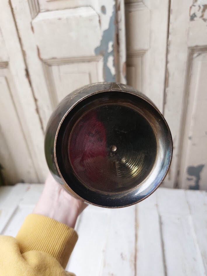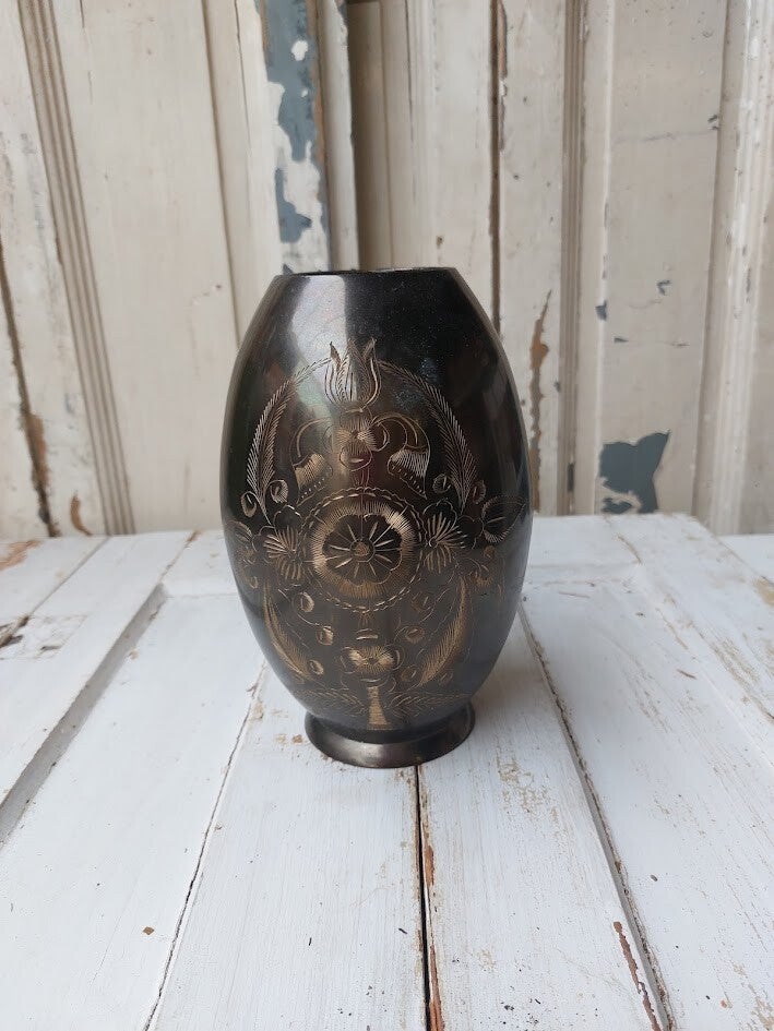 Deze vaas is een antiek, met de hand gegraveerd koperen object uit India, vaak gemaakt rond de jaren '70.
