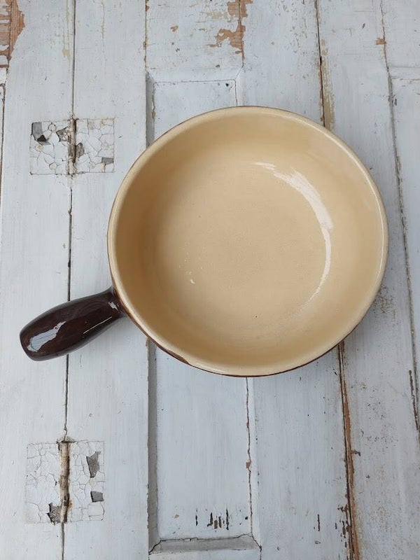 Deze vintage keramische pan is een typische Emile Henry "La Bourguignonne" pan uit Frankrijk, bekend om zijn rijke bruine glazuur aan de buitenkant en een crème-kleurige binnenkant.