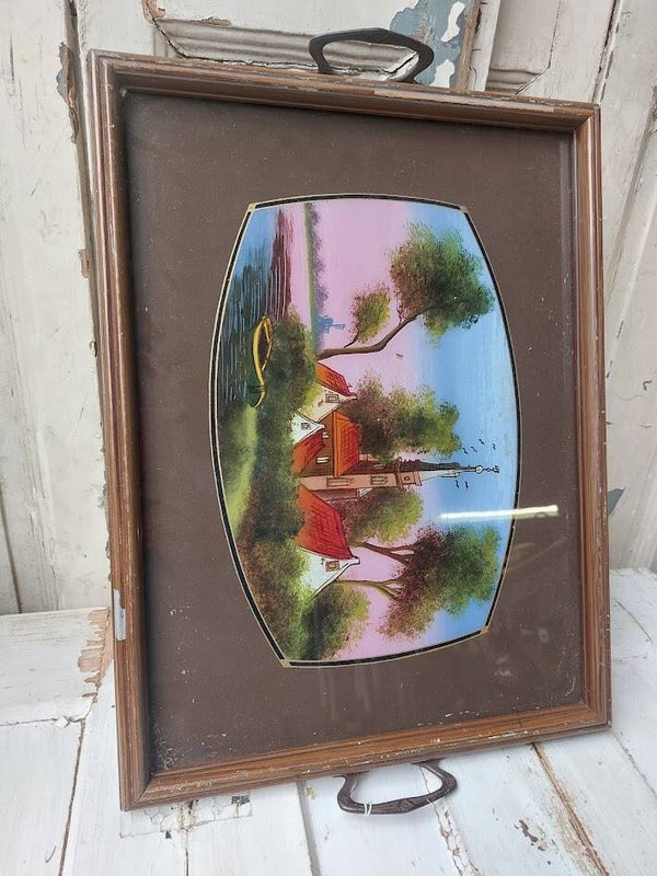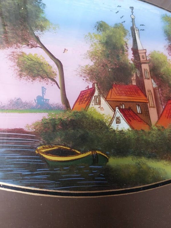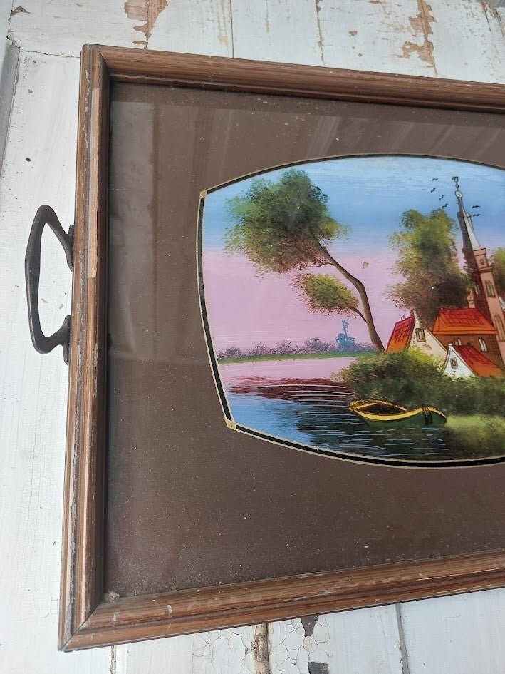 Het dienblad is voorzien van een glazen plaat met daarop een achterglasbeschildering van een Nederlands molenlandschap met huisjes en een bootje.