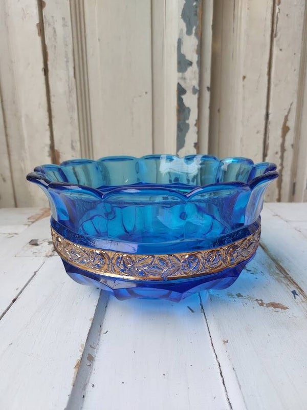 - Materiaal: Blauw geperst glas met een vergulde of bronskleurige metalen band.