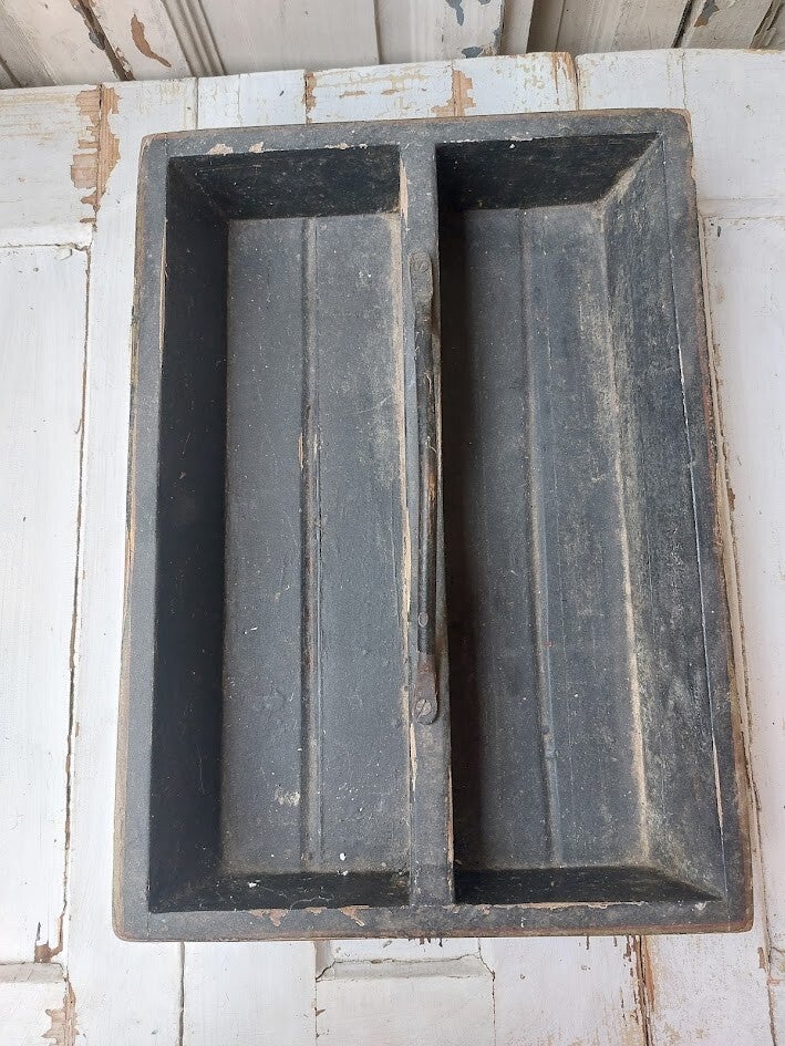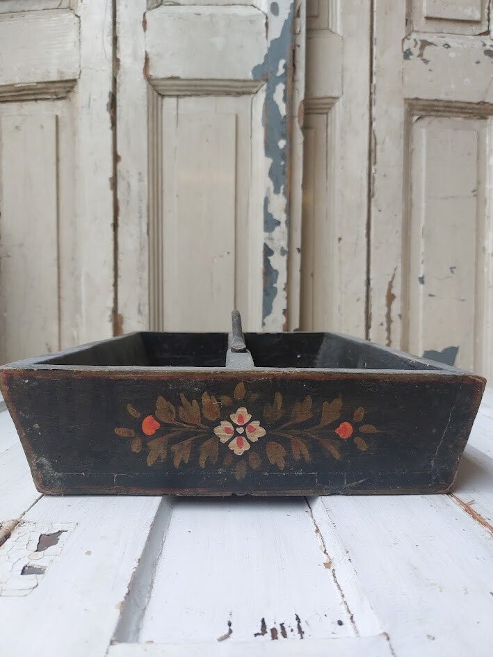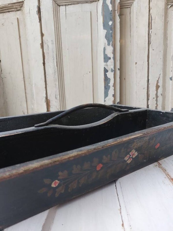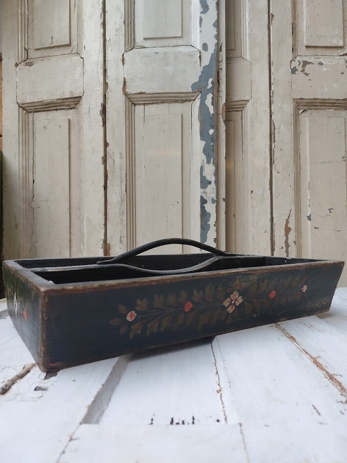 Deze antieke, handbeschilderde Scandinavische houten caddy is een uniek decoratief item.