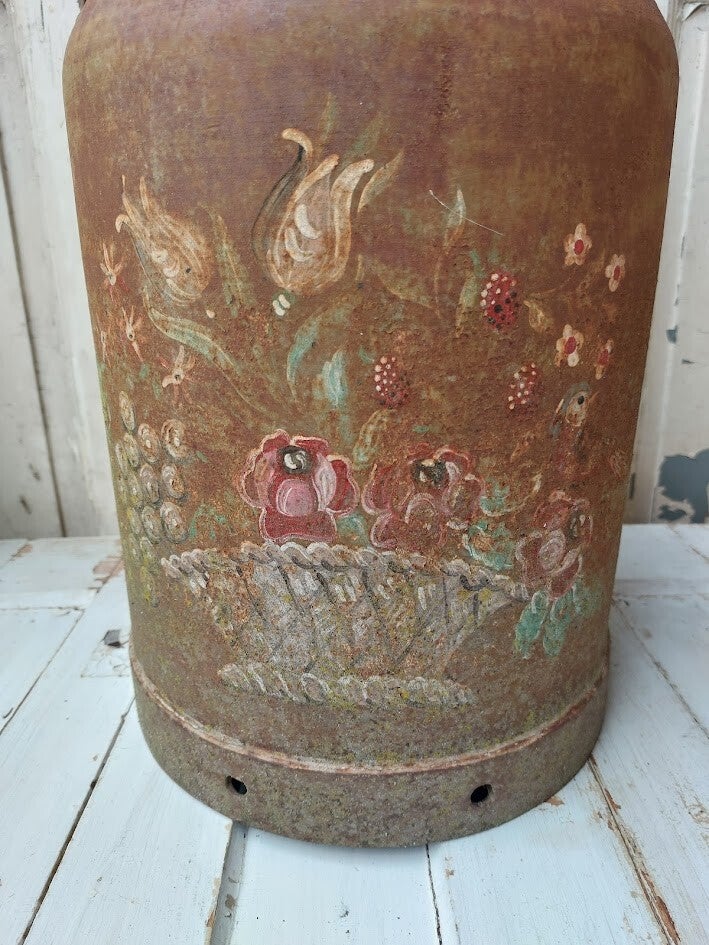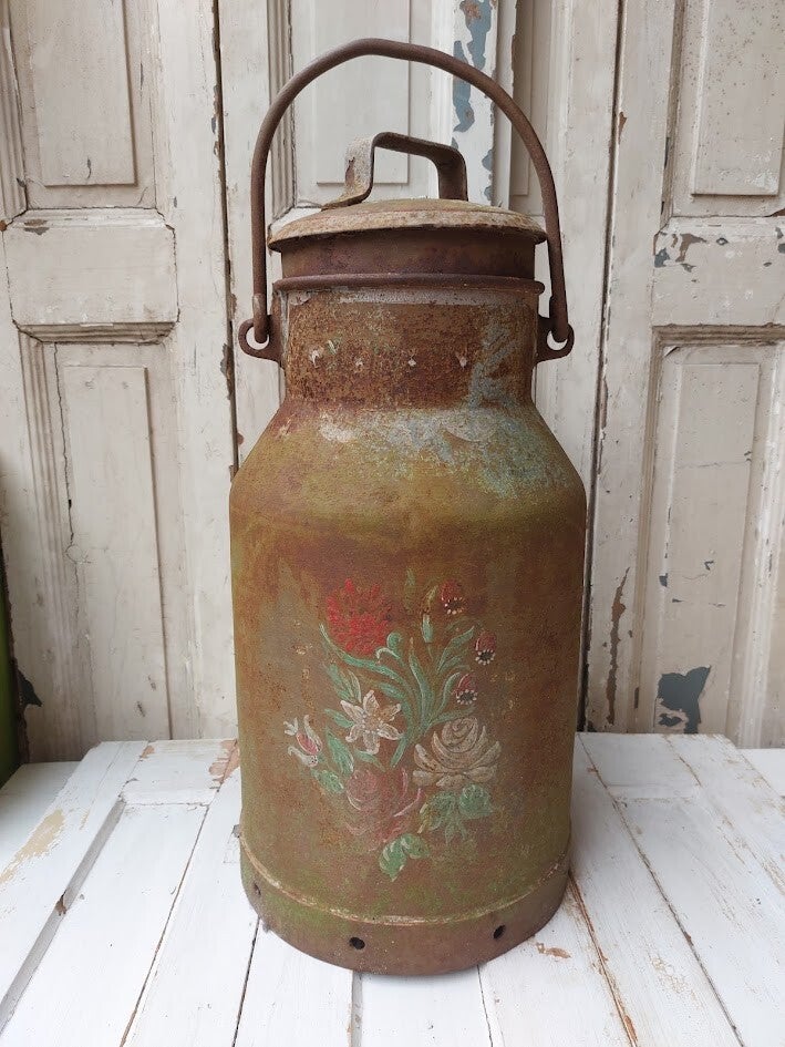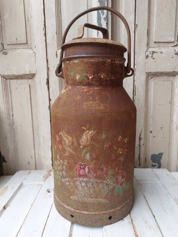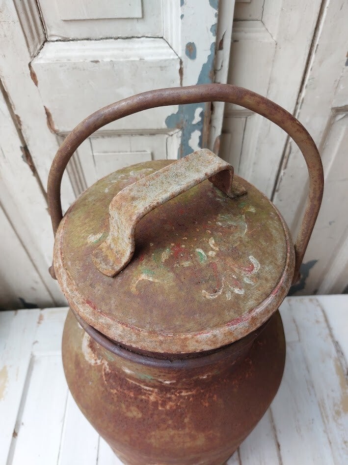 Het voorwerp is voorzien van een handgeschilderde bloemenmotief en vertoont duidelijke sporen van roest en ouderdom, wat duidt op een antieke status.