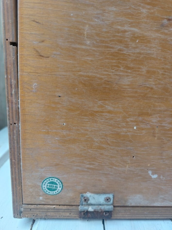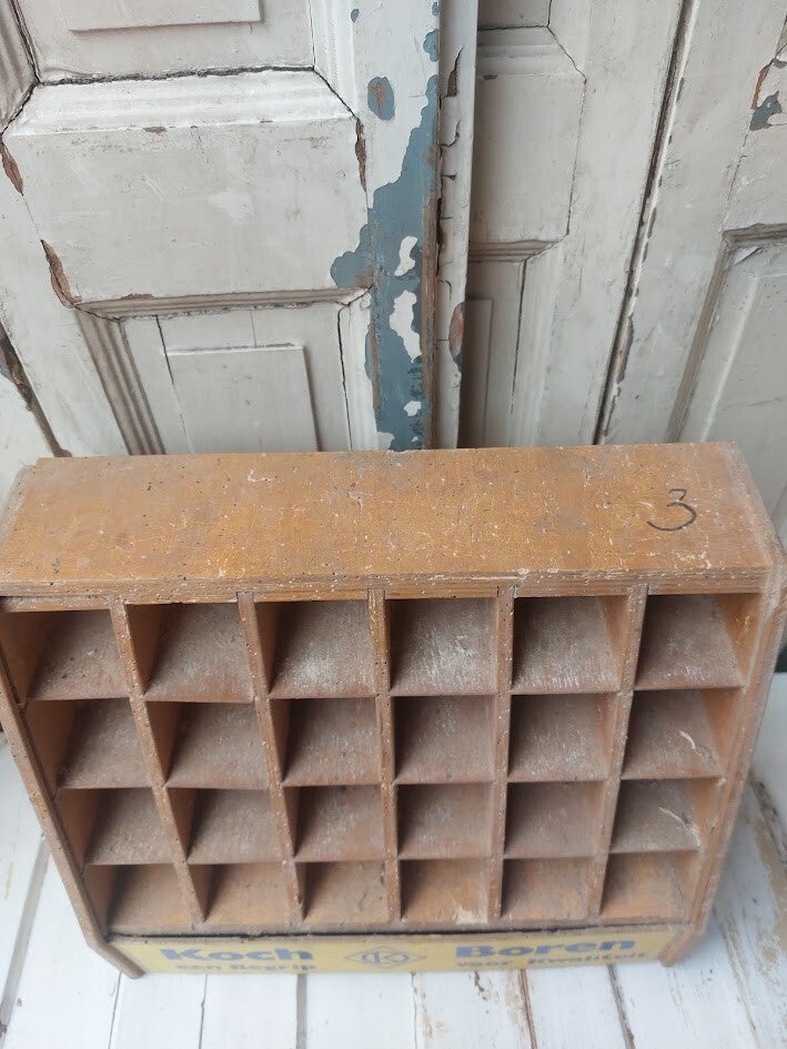 Het is een robuust houten rek met een geel reclamebord aan de onderzijde, wat typerend is voor winkelinterieurs uit de mid-20e eeuw.