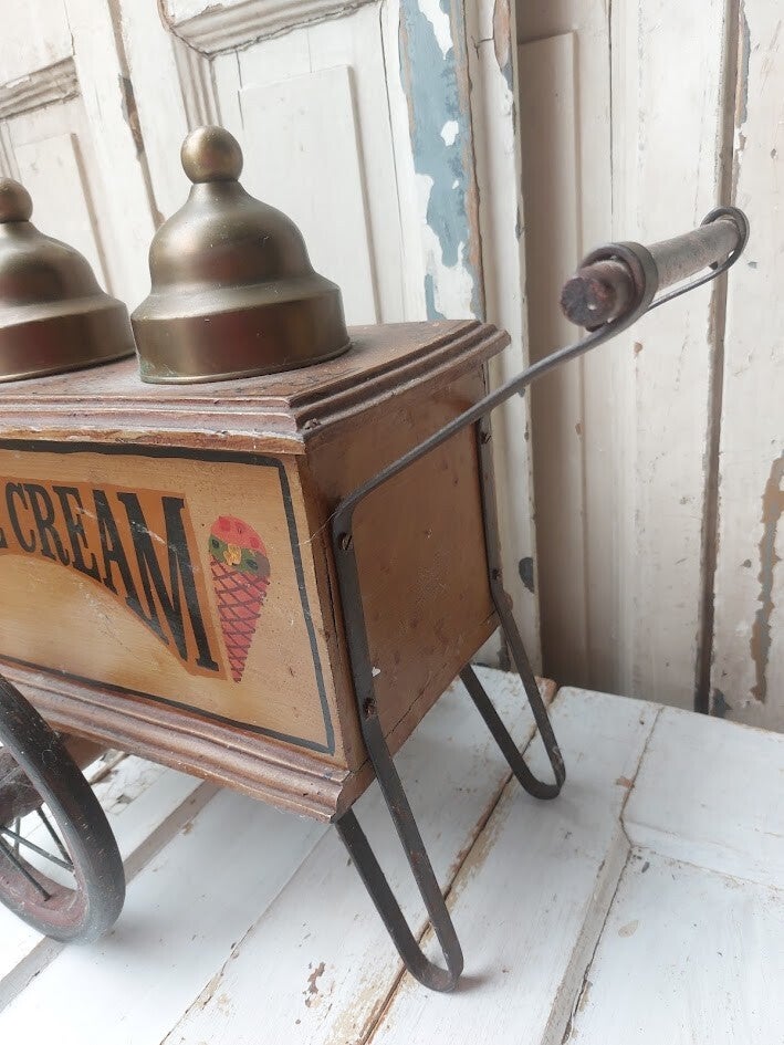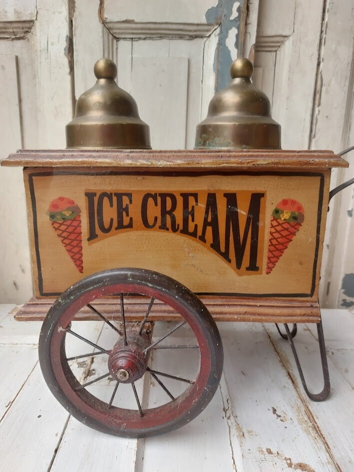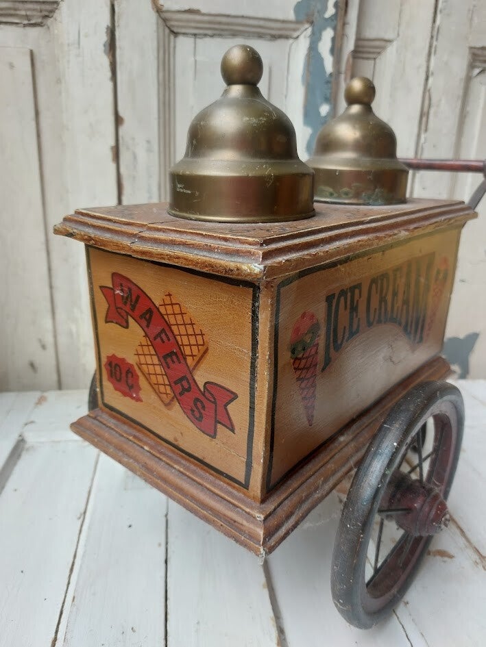 Houten behuizing met de tekst 'ICE CREAM' en twee bronskleurige deksels (potten) aan de bovenzijde. 40 cm